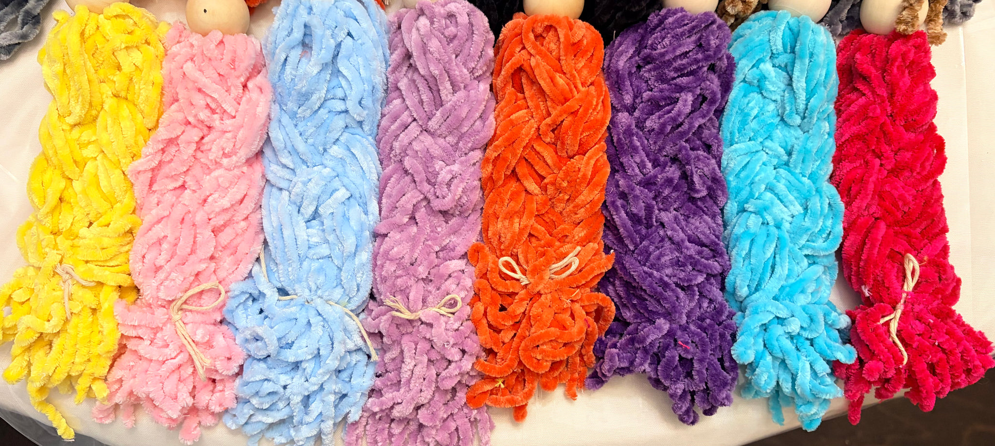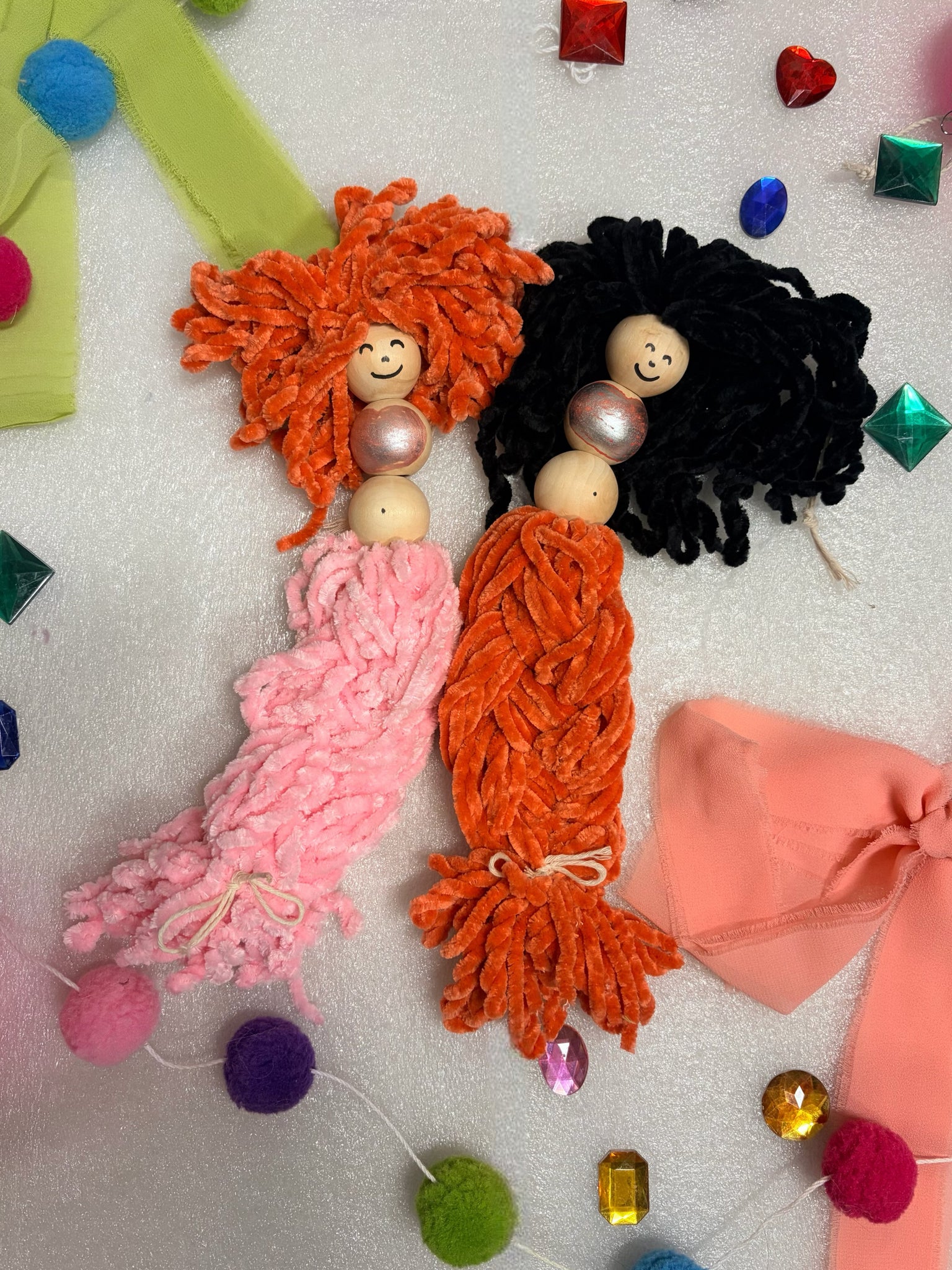 Wooden and yarn handmade (by EV) colorful mermaid ornaments.