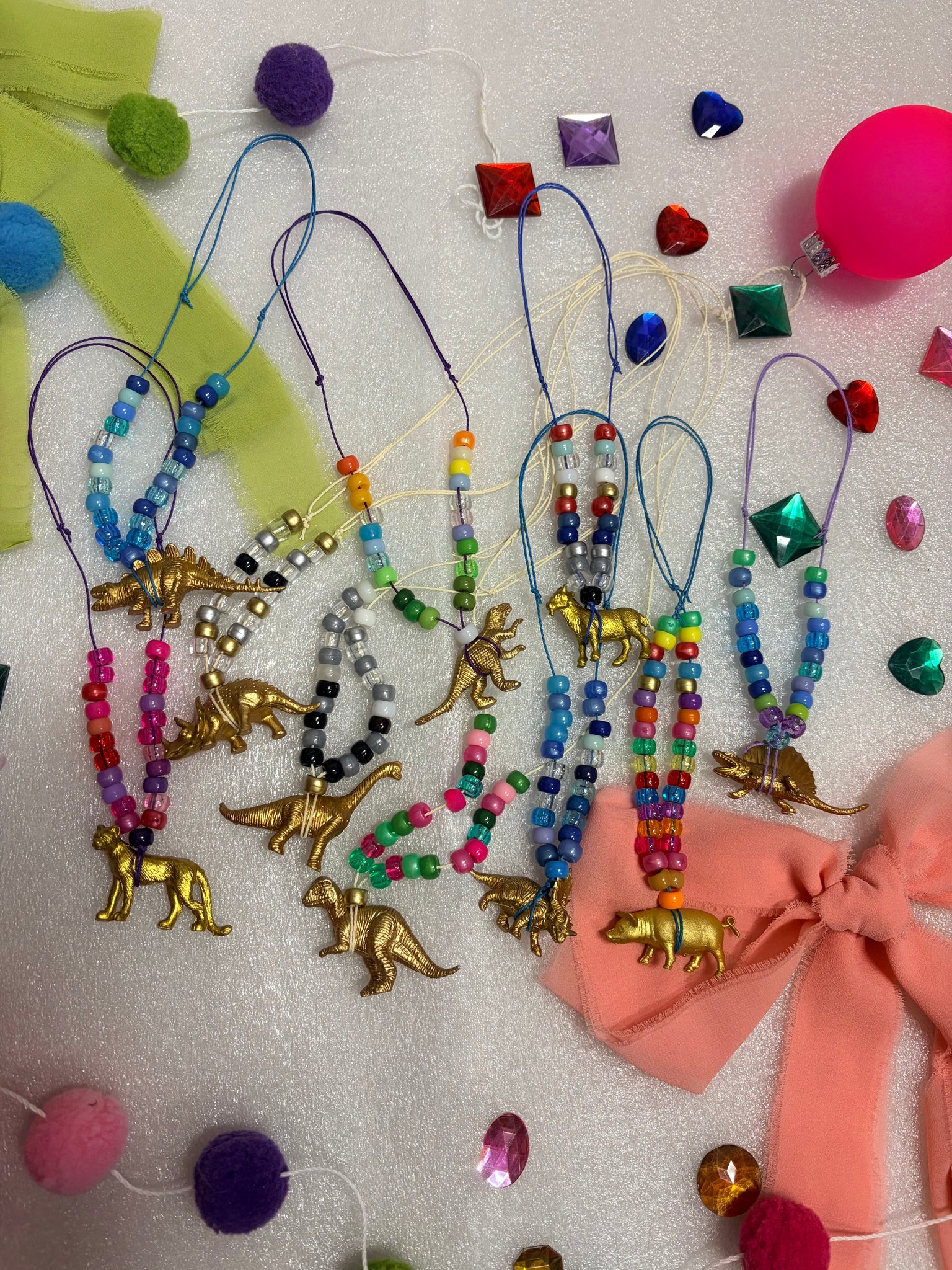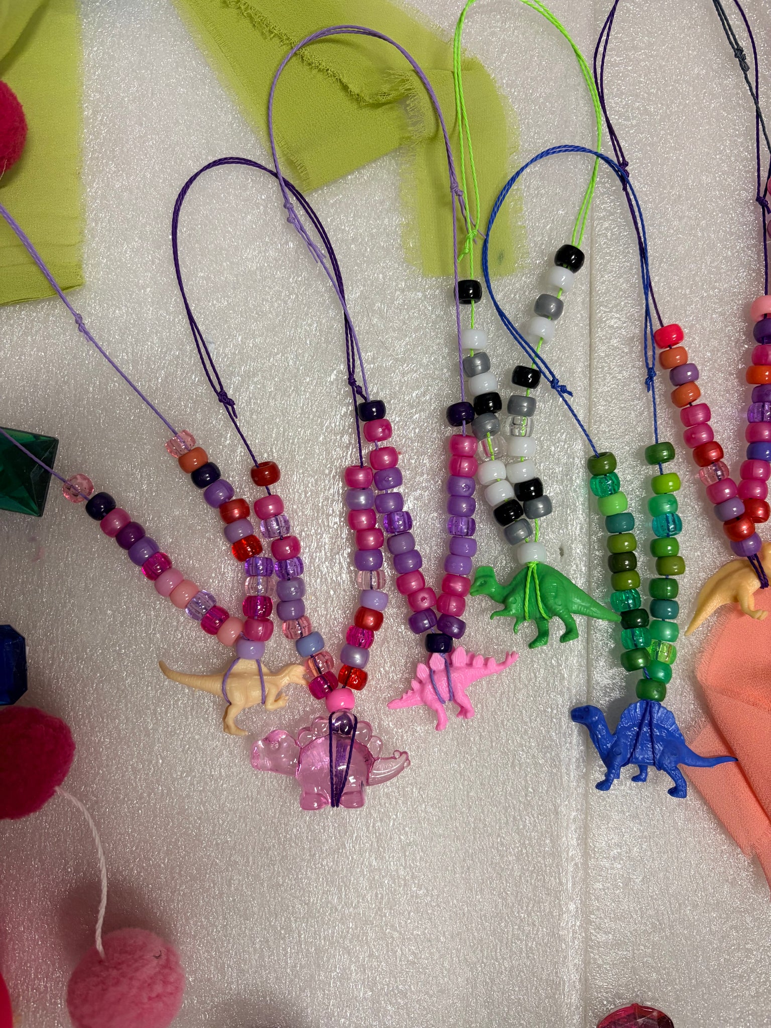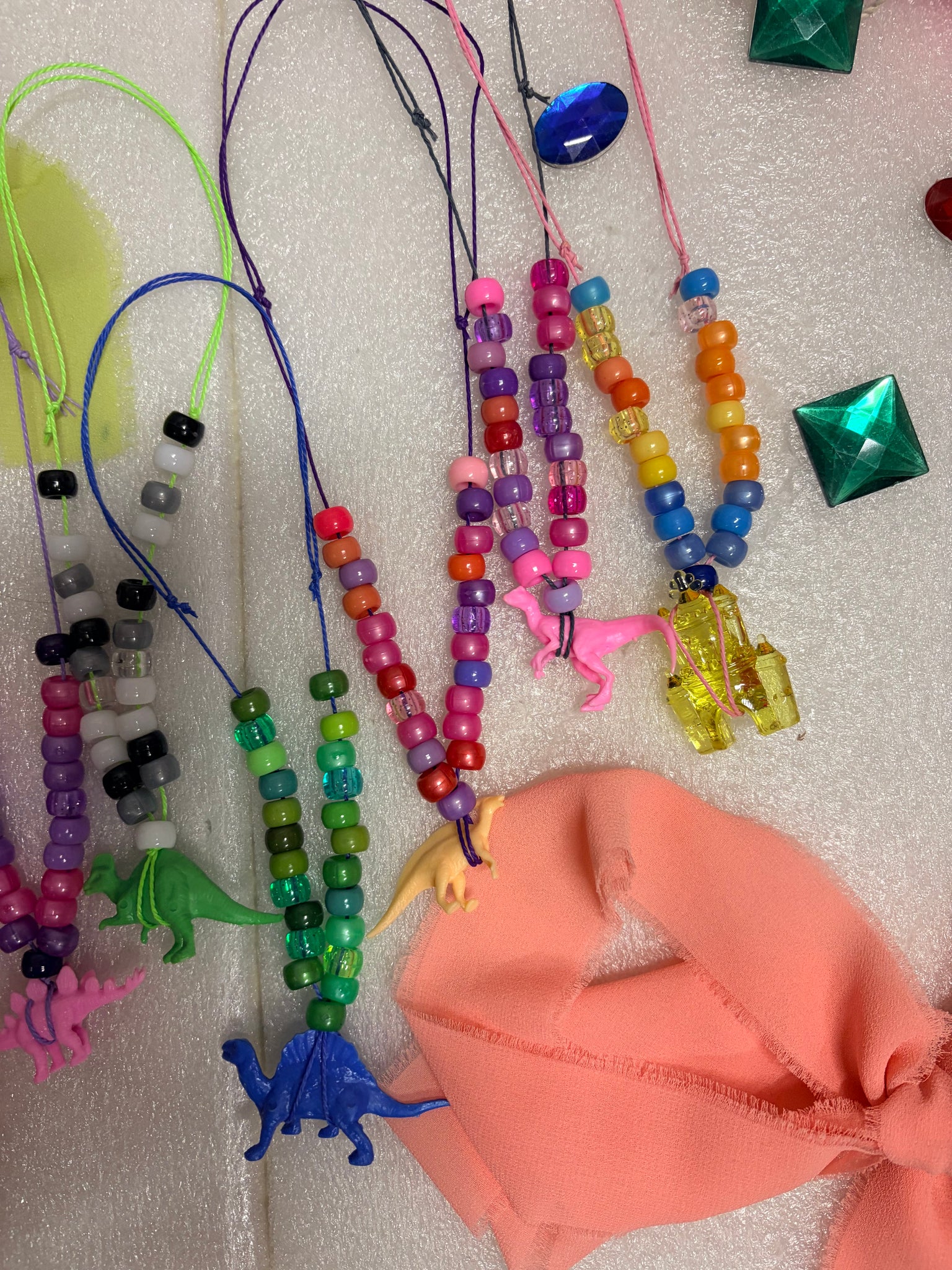 Evelyn is making necklaces to help pay for her camps this summer (dance camp and farm camp).